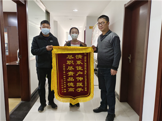 2月20日上午,上海路9號(hào)的周女士來(lái)到武漢城投房產(chǎn)集團(tuán)有限公司第一分公司,將一面印有“情系住戶伸援手 盡職盡責(zé)品德高”的錦旗送到工作人員手中,衷心感謝公司房管人員、工程維修人員,高效及時(shí)幫助其解決家中下水管道油污堵塞問(wèn)題,對(duì)他們認(rèn)真負(fù)責(zé)的工作態(tài)度和為住戶排憂解難的敬業(yè)精神表示由衷的肯定及感謝。